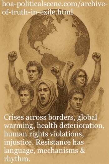 The Archive of Truth in Exile does not float in isolation or speak from a void. Its roots are grounded in the lived realities of human rights violations, political repression, economic dispossession, health crises, and systemic injustices that cross borders with ease. It stands as part of a wider landscape of resistance — a grassroots presence that confronts the forces that fracture communities and silence truth.
